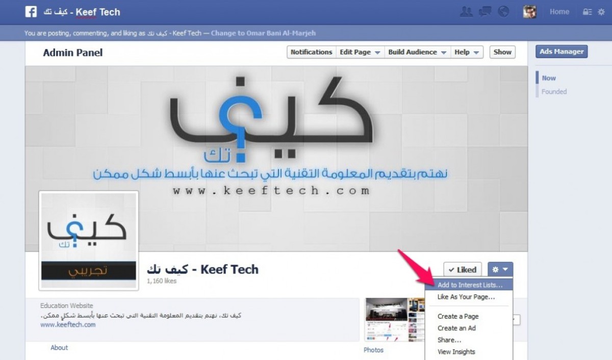 - إذا أردت إضافة صفحة جديدة ما إلى أحد قوائم الصفحات لديك، اذهب إلى الصفحة ثم اضغط زر “الإعدادات” Settings الموجود بجانب زر “أعجبني” Like ثم اختر “الإضافة إلى قائمة الاهتمامات” Add to interest lists وبعد ذلك اختر القائمة التي تريد أن تظهر منشورات الصفحة بها.